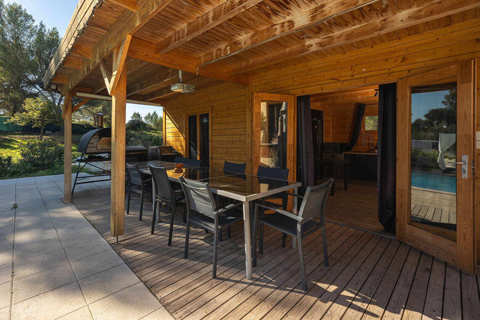 A l'extérieur, le terrain d'environ 2 500 m² conserve toute son intimité et s'anime autour d'une piscine chauffée par pompe à chaleur réversible, permettant de profiter des baignades tout au long de l'année. Un poolhouse parfaitement équipé, avec sa cuisine et sa terrasse couverte, complète cet espace de convivialité.